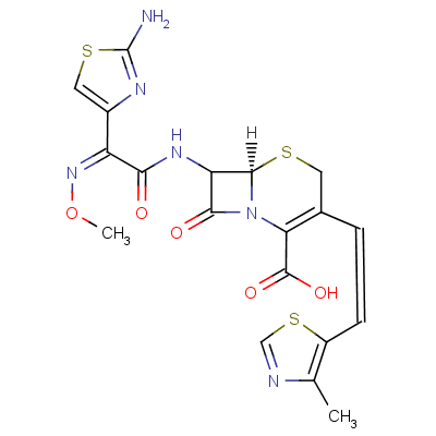 - InChI=1/C19H18N6O5S3/c1-8-11(33-7-21-8)4-3-9-5-31-17-13(16(27)25(17)14(9)18(28)29)23-15(26)12(24-30-2)10-6-32-19(20)22-10/h3-4,6-7,13,17H,5H2,1-2H3,(H2,20,22)(H,23,26)(H,28,29)/b4-3-,24-12-/t13?,17-/m1/s1